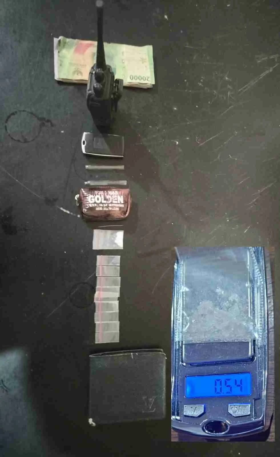 Dalam penggeledahan, petugas menemukan barang bukti di teras depan rumah, termasuk satu dompet kecil warna coklat bertuliskan “Toko Mas Golden” yang berisi plastik klip transparan berisi sabu seberat 0,54 gram.