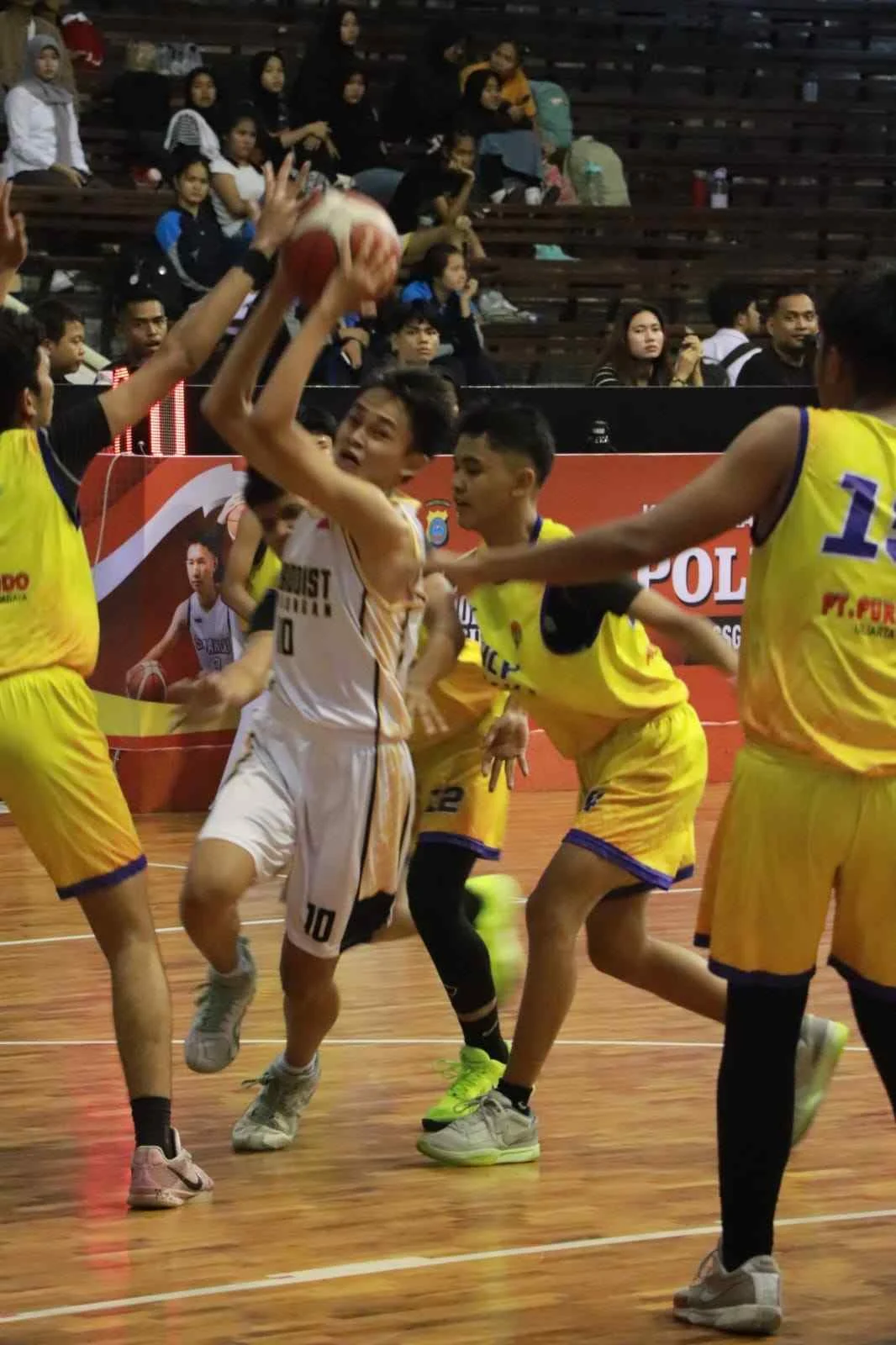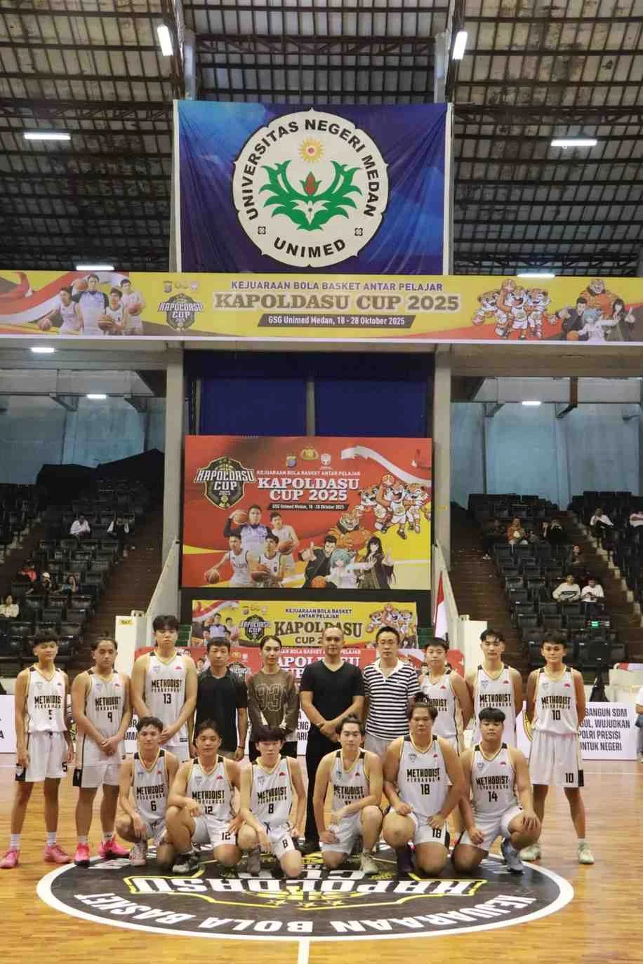 MATANEWSTV.com | Serdang Bedagai, 20 Oktober 2025 — Suasana penuh semangat mewarnai jalannya pertandingan Turnamen Basket Kapoldasu Cup 2025 antara SMA Methodist Perbaungan dan SMA Cahaya Medan. Dalam laga yang berlangsung sore hari pukul 16.00 WIB tersebut, tim Methodist Perbaungan tampil dominan dan berhasil mengamankan kemenangan meyakinkan dengan skor akhir 34–17.