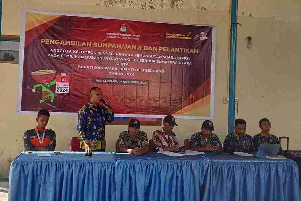 Deliserdang —  Sebanyak 70 petugas Kelompok Penyelenggara Pemungutan Suara (KPPS) dari 10 Tempat Pemungutan Suara (TPS) di Desa Baru, Kecamatan Batang Kuis, resmi dilantik dan diambil sumpah/janji untuk tugas mereka pada Pilkada Deliserdang 2024.