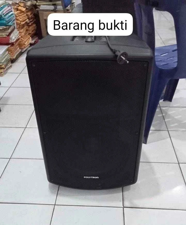 Barang bukti berupa satu unit speaker aktif merk Polytron telah diamankan bersama kedua tersangka.