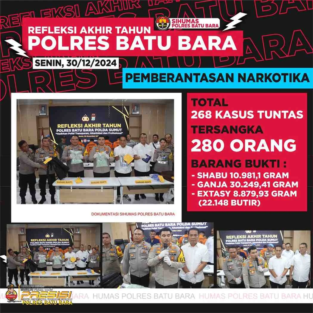 Adapun dalam penanganan kejahatan transnasional, Polres Batu Bara berhasil mengungkap 280 kasus narkoba, 4 kasus kejahatan siber, dan 2 kasus perdagangan manusia.