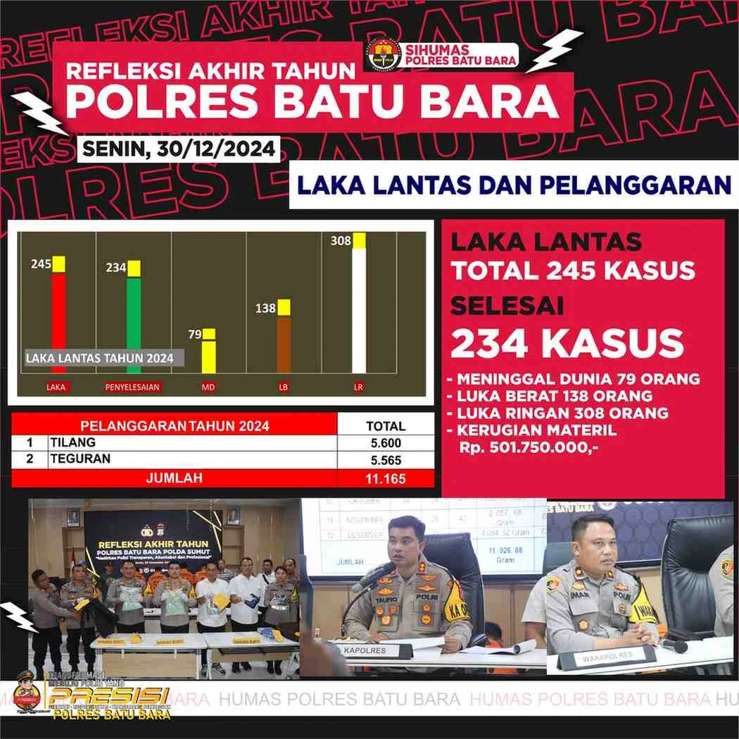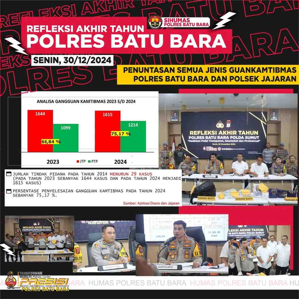 Kapolres AKBP Taufiq mengungkapkan bahwa sepanjang 2024, Polres Batu Bara menangani 1.615 kasus gangguan keamanan dan ketertiban masyarakat (kamtibmas), dengan tingkat penyelesaian kasus mencapai 75,17 persen.