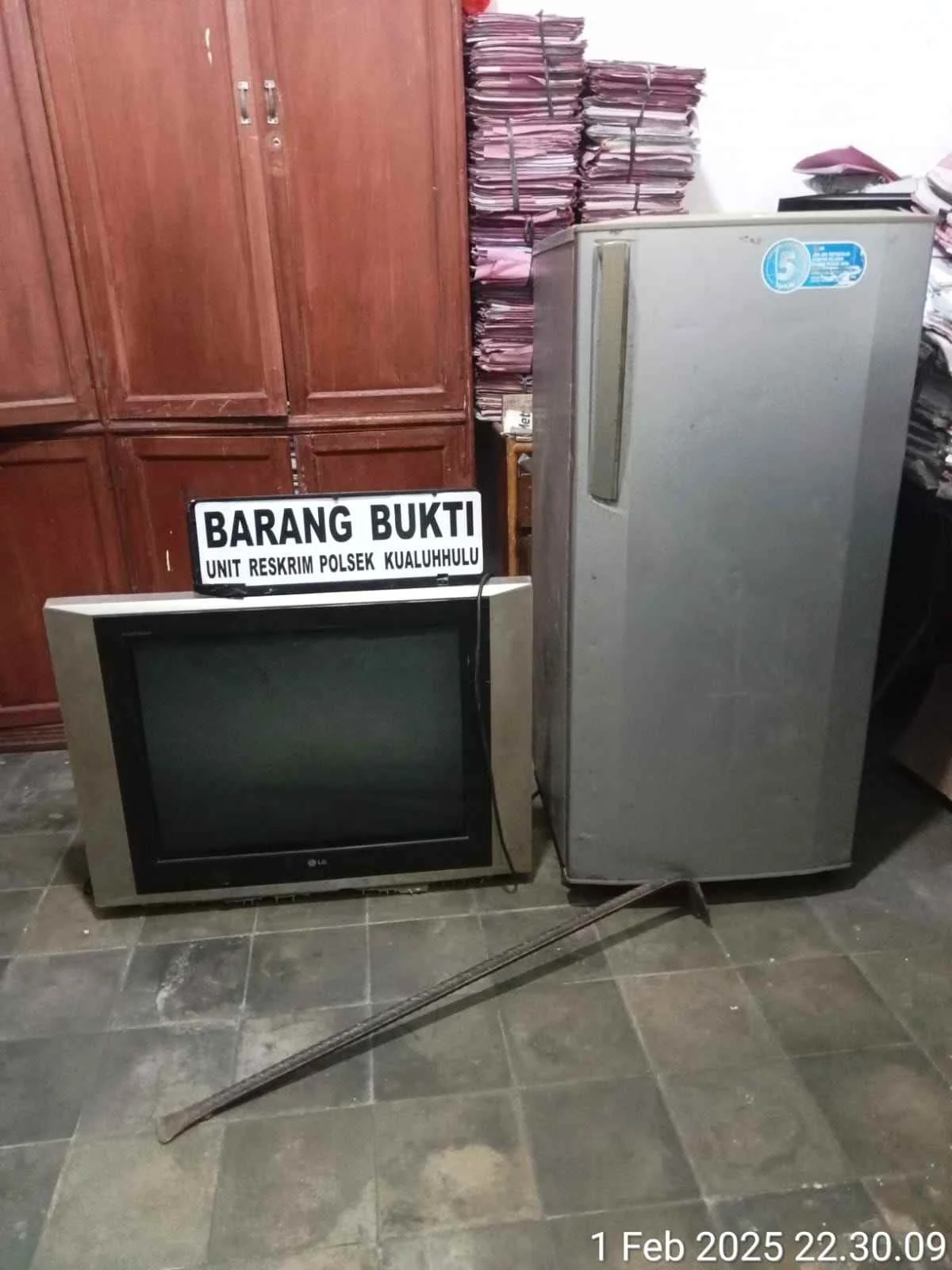 Dari tangan para pelaku, polisi mengamankan sejumlah barang bukti, termasuk satu unit becak motor, satu buah linggis, satu lemari es, serta satu unit televisi merek LG.